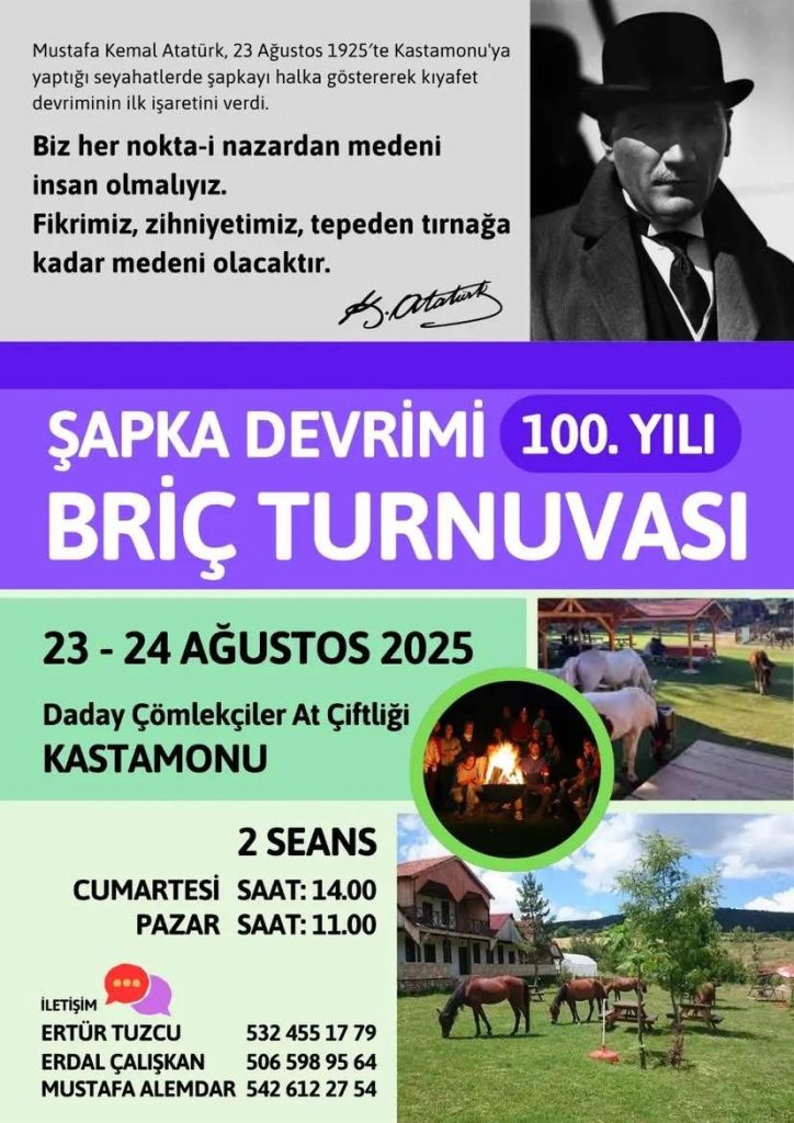 ŞAPKA DEVRİMİ 100.YIL BRİÇ TURNUVASI Kayıt Kayıt Olanlar 23-24 AĞUSTOS 2025 DADAY/KASTAMONU TURNUVAMIZ SARI MASTERPOİNT ÖDÜLLÜDÜR.